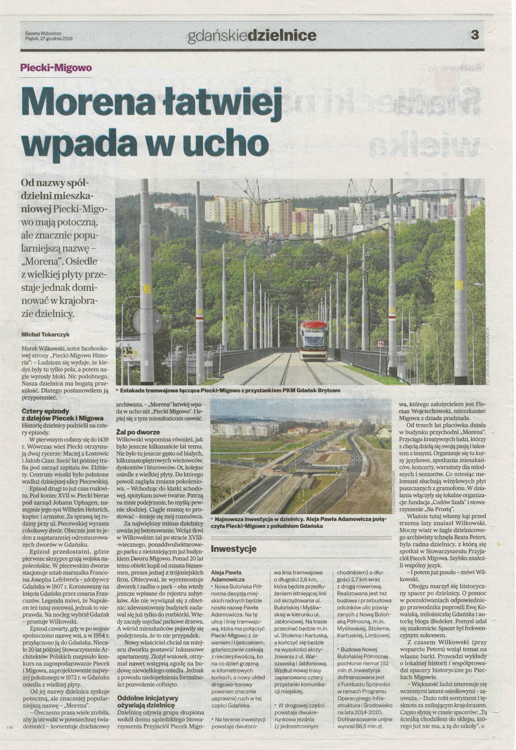 W grudniu 2019 w Gazecie Wyborczej (dodatek Trójmiasto) ukazał się artykuł Michała Tokarczyka „Morena łatwiej wpada w ucho”, w którym jest mowa o historii dzielnicy, trochę o współczesności, oraz o tym, jak wykluł się blog o historii dzielnicy Piecki-Migowo prowadzony przez Marka Wilkowskiego:
